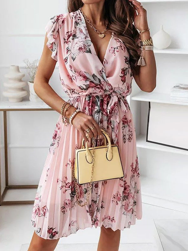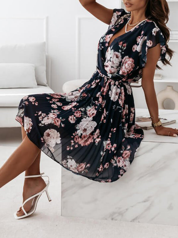 Floral midi dress with a wrap-style front, V-shaped neckline, and a tie waist belt. The design features short flutter sleeves, a pleated skirt construction, and a printed outer surface.